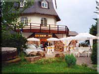 Die Außenterasse zwischen Mühle und Nebenhaus - wie geschaffen für die Freiluft-Saison auf weißen Gartenstühlen oder am Stehbier-Tisch.
